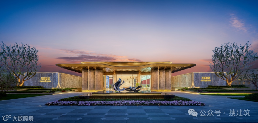 对标一线豪宅,打造近36米、近10米、约1000㎡高奢阔酒店式府门,主入口,配置有星空顶和罗汉松,门前打造有超20米黑金沙整石水景,并臻选爱马仕灰石材及香槟金铝板材料定制,营造新奢艺术生活方式。
