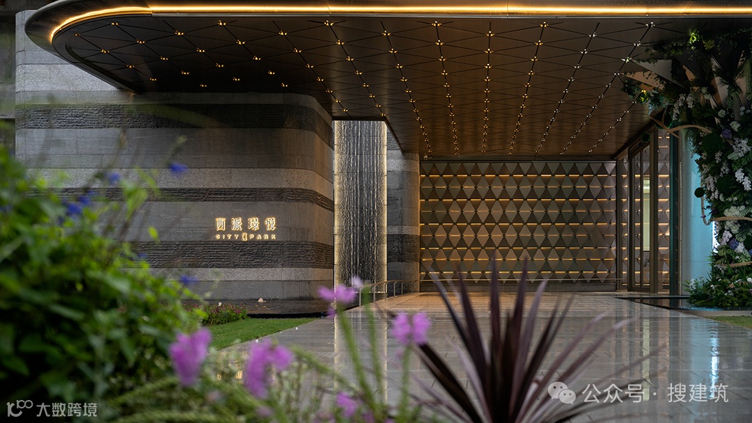 社区主入口门庭汲取安缦酒店设计风格,结合干挂石材与铝板材质以及鎏金顶,再伴随潺潺流水的叠水小景,打造出一条尊贵感极强的归家礼序。