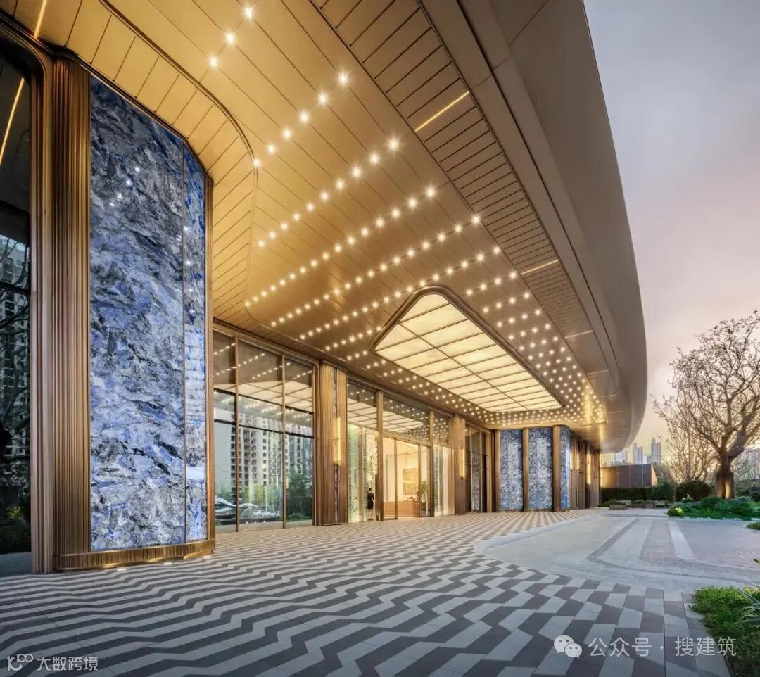 入口顶部设计有一大块透光云石板,周边点缀星星点点的灯光,温润的色彩为空间增添更多宁静,也为建筑增加了更多温度。蓝宝石岩板与香槟色不锈钢的经典搭配,使整个入口空间熠熠生辉,典雅的色调及材料的自然纹理镌刻空间的奢华,尽显庄重的归家礼仪。