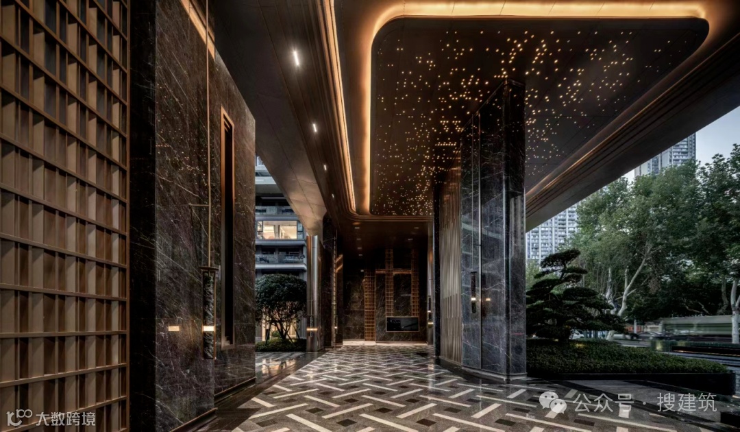 整个入口大面积使用天然花岗石石材和深咖色铝合金,局部点缀奢石与精美手绘图案,再加上总价超百万元的造型乔木,大气典雅,形成所在街区的奢阔城市界面。