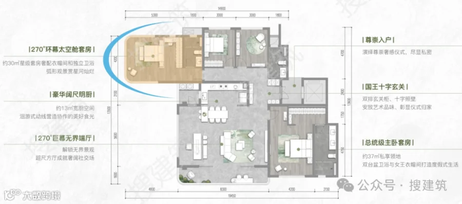 仁和春天29号院约200㎡边厅户型,同样打造了三面全景舱主卧套房,自带高光的约36㎡超豪华套房。