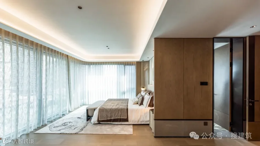 主卧套间约45㎡,同样约270°无柱景观面,创造约16.9米U型采光,领先同面积段。这个户型的许多配置,基本只有在200+㎡中才能见到。
