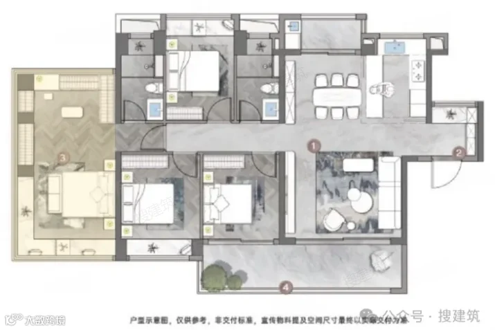 长沙邦泰·璟和约126㎡四房,则更进阶一步,堪比160㎡的空间感,适合首改人群。