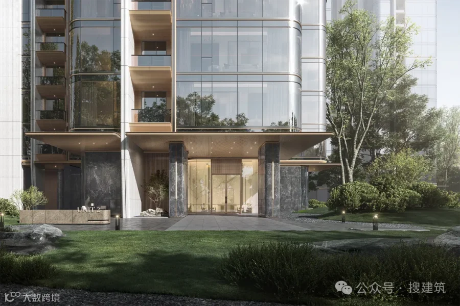 立面配以全【大面积玻璃幕墙+陶板+铝板 】的超奢材质,整个建筑外立面没有任何漆面。舍得花成本+顶尖设计机构,效果是不言而喻的:给人以奢感品质,地标性豪宅之感。