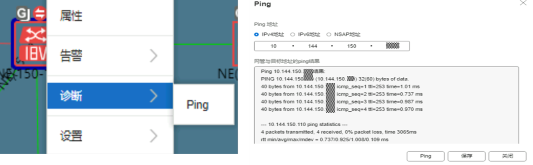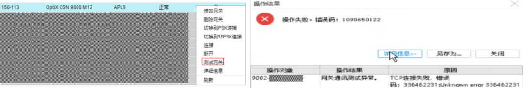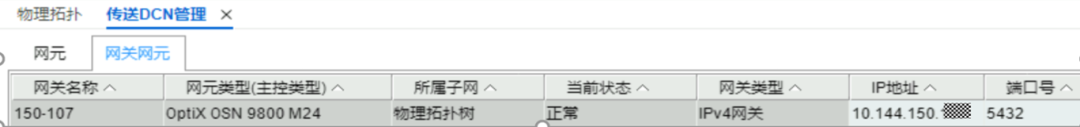 3、“传送DCN管理—网关网元”右键网关执行“测试网关”,可以测试网关网元的IP是否通,以及1400或5432端口是否能正常访问。如果提示”TCP连接失败”,可能外部DCN网络设备禁止访问该端口报文通过,或者设备主控故障,或者设备socket连接已满。