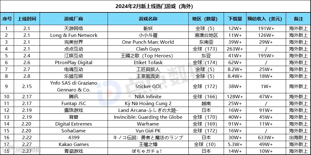 海外市场方面,上月仍是有18款新游进入到我们的视野,数量变化不大。但欧美地区的手游热门新品数量凋零的情况仍然存在,新品多为休闲分类。而国内厂商则是在国内春节档发力的同时,并未停止游戏出海的输出。