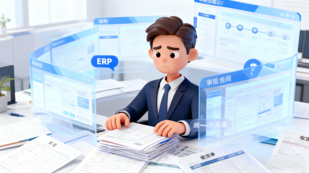 合同在合同库,发票在系统里,审批流埋在 OA,纸质档案还在档案室。