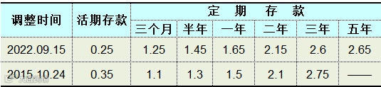 注意利率口径不同:①2015.10.24的口径是央行公布的存款基准利率;②2022.09.15的口径是国有大型商业银行实际的挂牌利率,即在存款基准利率的基础上有所浮动。