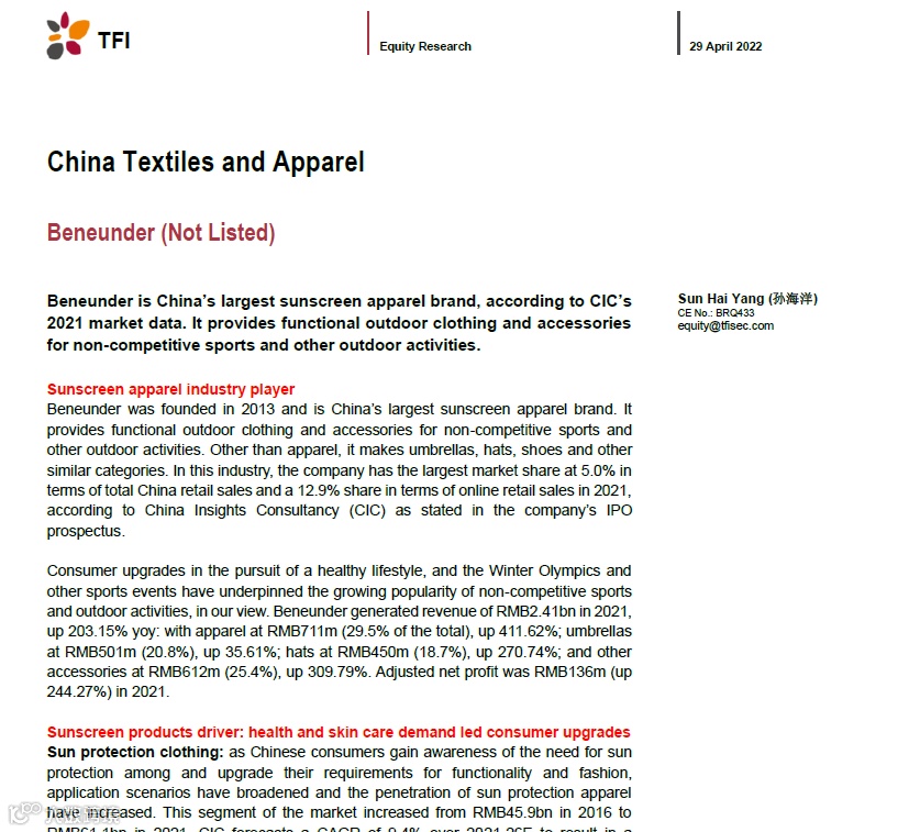 Beneunder was founded in 2013 and is China’s largest sunscreen apparel brand. It provides functional outdoor clothing and accessories for non-competitive sports and other outdoor activities. Other than apparel, it makes umbrellas, hats, shoes and other similar categories. In this industry, the company has the largest market share at 5.0% in terms of total China retail sales and a 12.9% share in terms of online retail sales in 2021, according to China Insights Consultancy (CIC) as stated in the company’s IPO prospectus.