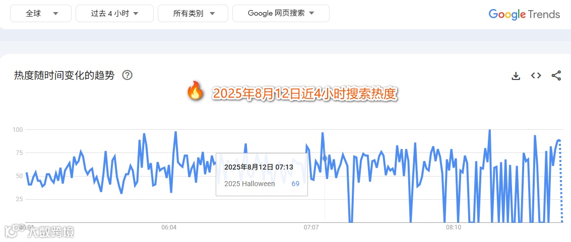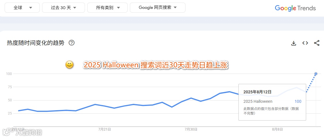 进入8月,对于爱过节的欧美人来说,已经开始期待万圣节了。谷歌趋势显示,近30天内,“2025 Halloween”(2025年万圣节)一词,在全球范围内的搜索热度呈现持续上升趋势,从8月份开始其热度就增长至75-100之间,并预测将会在8月中旬达到搜索热度高峰。