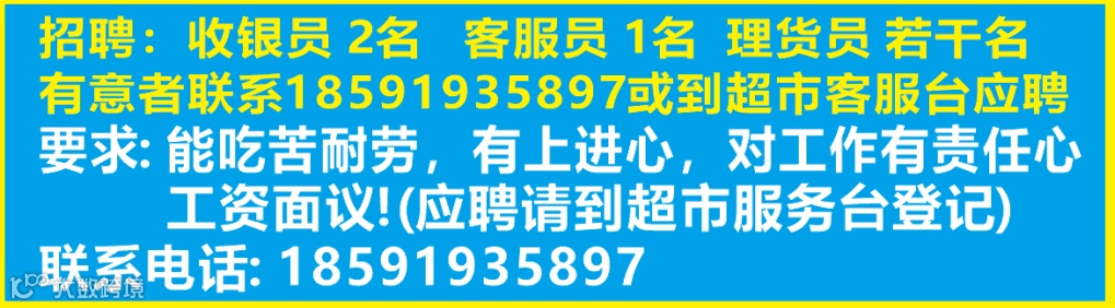 导读:招聘精英:电脑员、收银员、理货员、促销员应聘请到客服台登记团购电话:16571122333​​​地址:西安市经开区凤城七路与开元路十字东南角凤城庭院西门