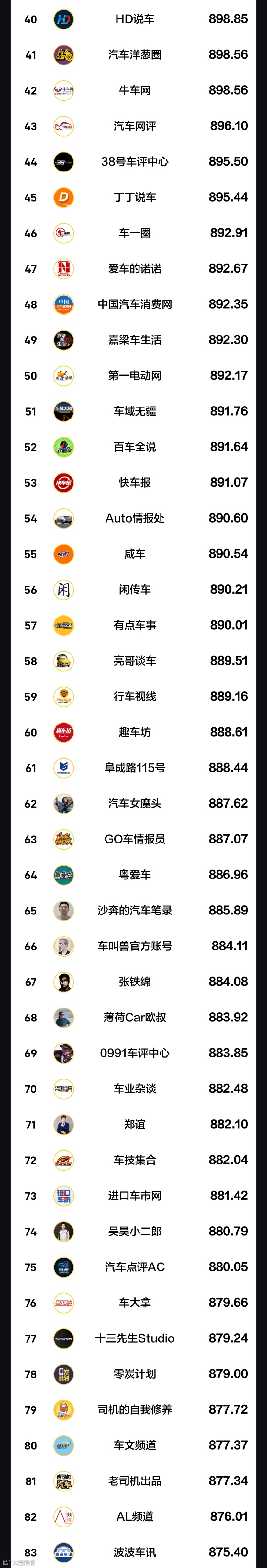 - 懂车号综合影响力榜:排名以【账号质量】、【内容质量】、【平台活跃】三大维度作为计算依据,对粉丝总量、涨粉趋势、内容传播及发布数据、懂车号发文占比、活动参与度、Power等级等多个指标进行综合计算而得,覆盖文章、中视频、小视频、直播、懂车分5种内容体裁;