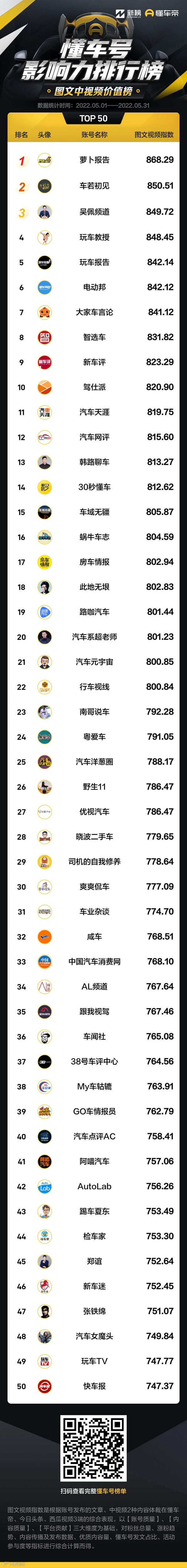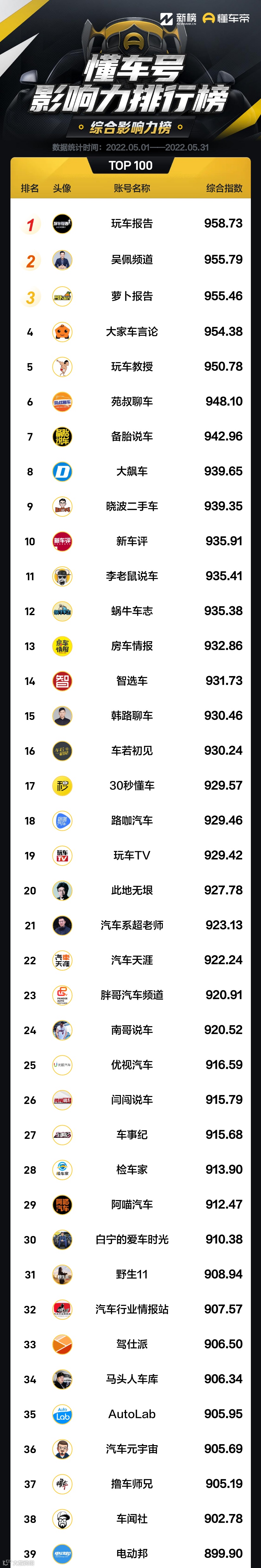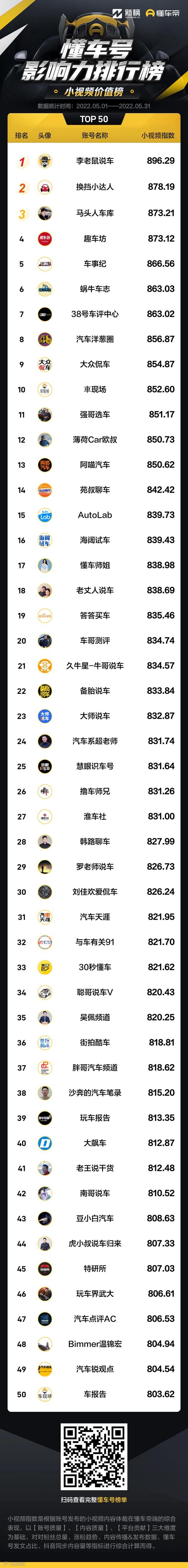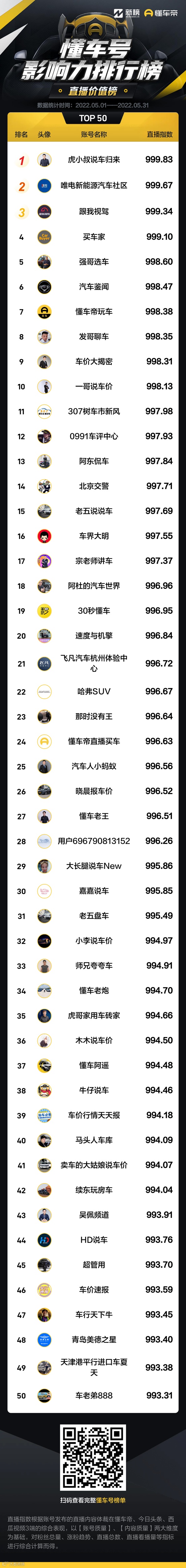 以下为5月懂车号影响力榜单: