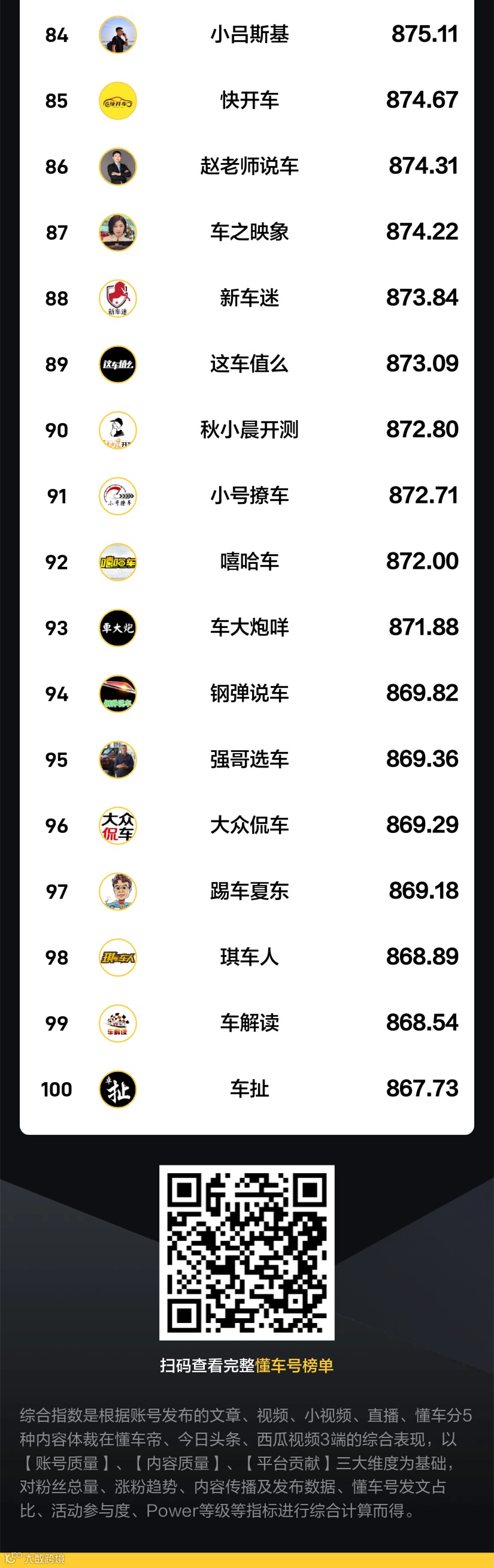 - 懂车号图文中视频价值榜:排名以【账号质量】、【内容质量】、【平台活跃】三大维度作为计算依据,对粉丝总量、涨粉趋势、内容传播及发布数据、优质内容量、爆款内容量、懂车号发文占比、活动参与度等等多个指标进行综合计算而得,覆盖文章、中视频2种内容体裁;