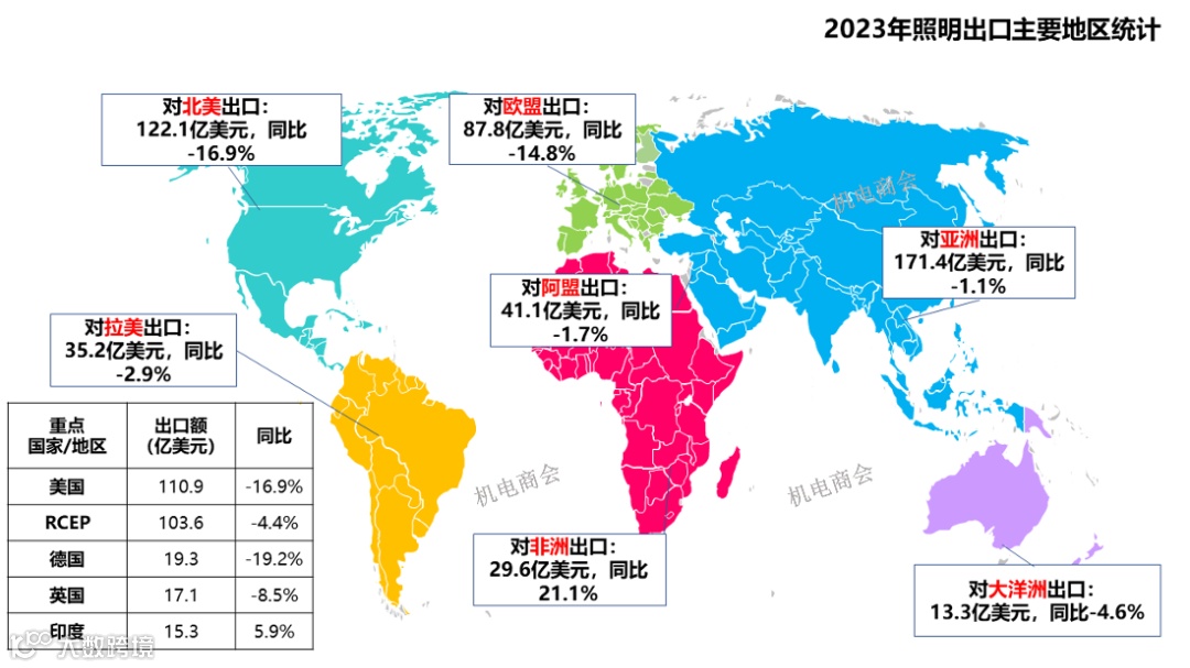 从市场分布来看,亚洲大洋洲(含RCEP15国)、北美、欧盟、英国及中东市场仍为中国照明产品主要出口目的地[k]。