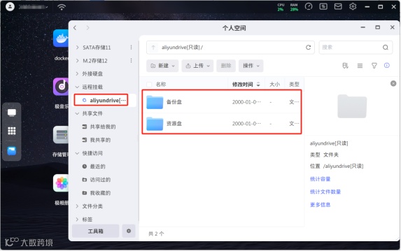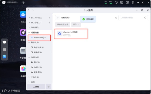 比如你的阿里云盘里有学习资料、工作文档,不用再下载到极空间,挂载登录后直接在极空间里看到并管理这些文件,就像用本地硬盘一样。无论是学生党还是上班族,用起来都会非常方便。