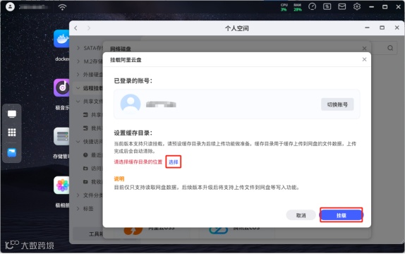 (3)登录后,选择好缓存目录的位置后,点击挂载