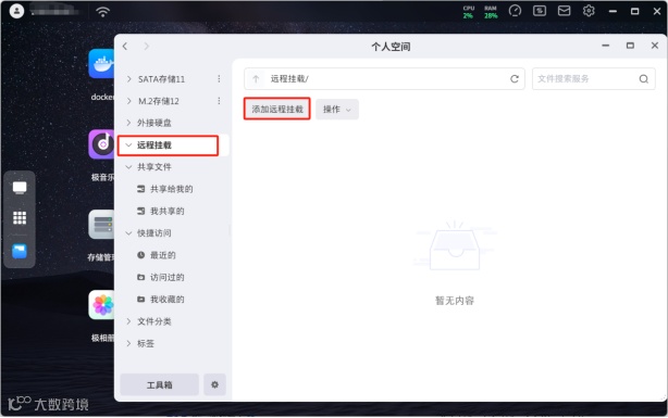 (1)打开极空间里的个人空间,点击远程挂载,再点击添加远程挂载
