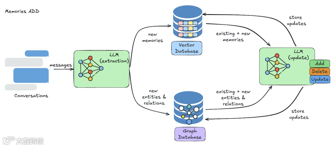 记忆层添加记录的方式如下图所示,Mem0 通过 LLM 提取内容后,通过添加或者更新的方式,同时将内容 embedding 到向量库和提取实体&关系到图谱数据库中。