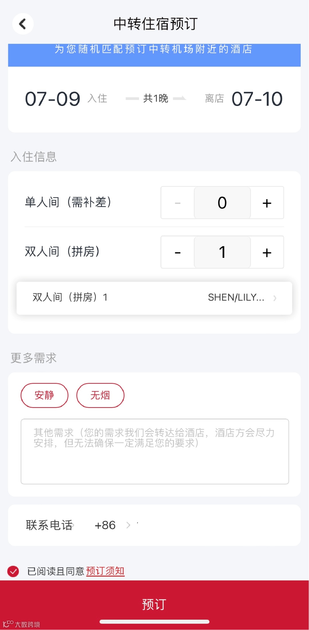 此服务仅限乘机人本人使用,需在第一段航班计划起飞12小时前完成酒店预订,免费提供的中转酒店服务不提供发票。