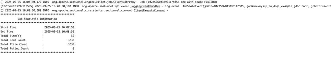 cd "apache-seatunnel-${version}"./bin/seatunnel.sh --config ./config/mysql-to-dsql.conf -m local