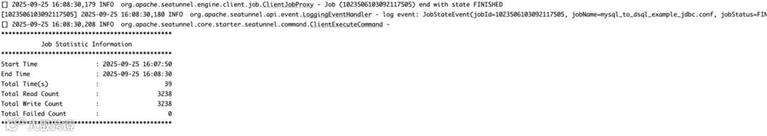 cd "apache-seatunnel-${version}"./bin/seatunnel.sh --config ./config/mysql-to-dsql.conf -m local