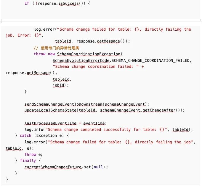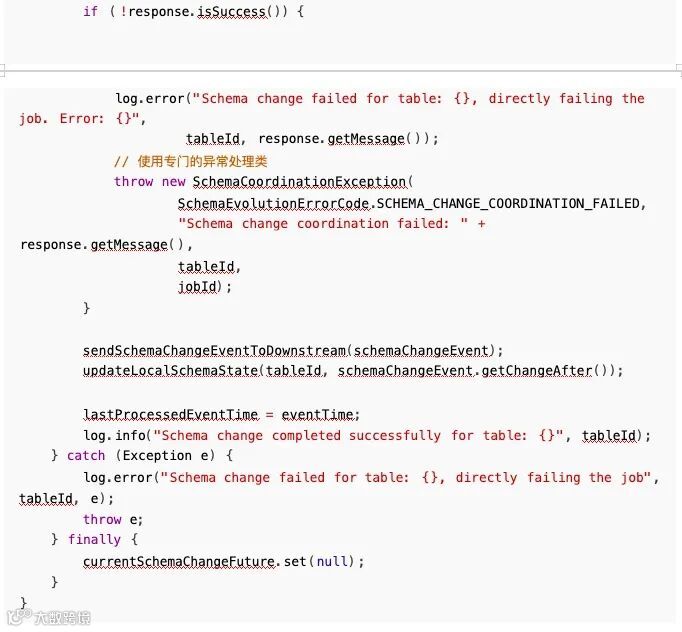 Flink CDC 的实现是直接标记失败,之后从检查点恢复,目前我采用的是标记失败的策略,考虑的点 是,主动回滚开发相当麻烦,可能还需要 flink ck 进行适配,直接让 schema 变更失败时抛出异常,让现 有的重试机制处理就行,而且也观察到 SeaTunnel 这边做了重试相关的机制, Flink自己有全局重试策略,no ,fixed-delay ,failure-rate(已实现,已测试)。