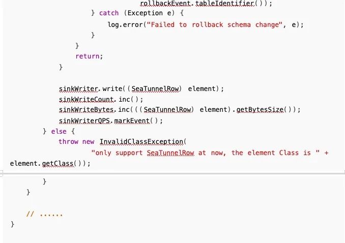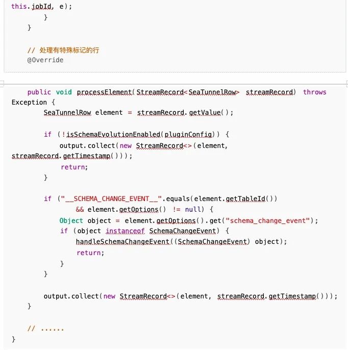 在 SeatunnelRow 中添加特殊标记,比如在 options 里面添加一个选项,如果遇到事件,存储到额 外信息里面,这样对链路入侵性不高,但是违反单一设计原则,按理来说 SeatunnelRow 不应该关 心事件,只负责数据流转,之后如果架构升级可以重构,目前以实现功能为主,减小风险。
