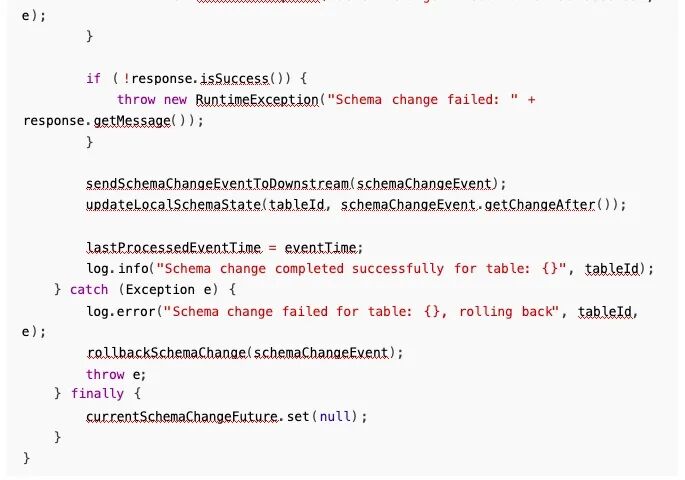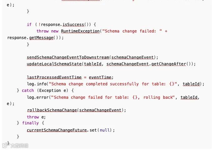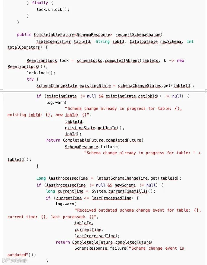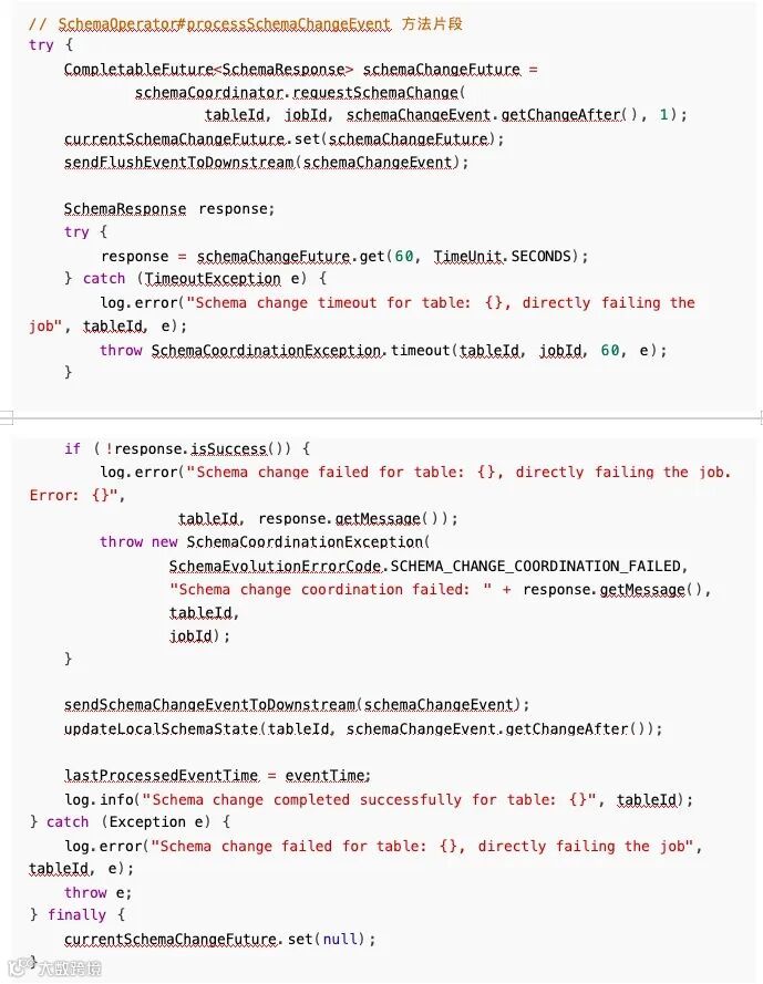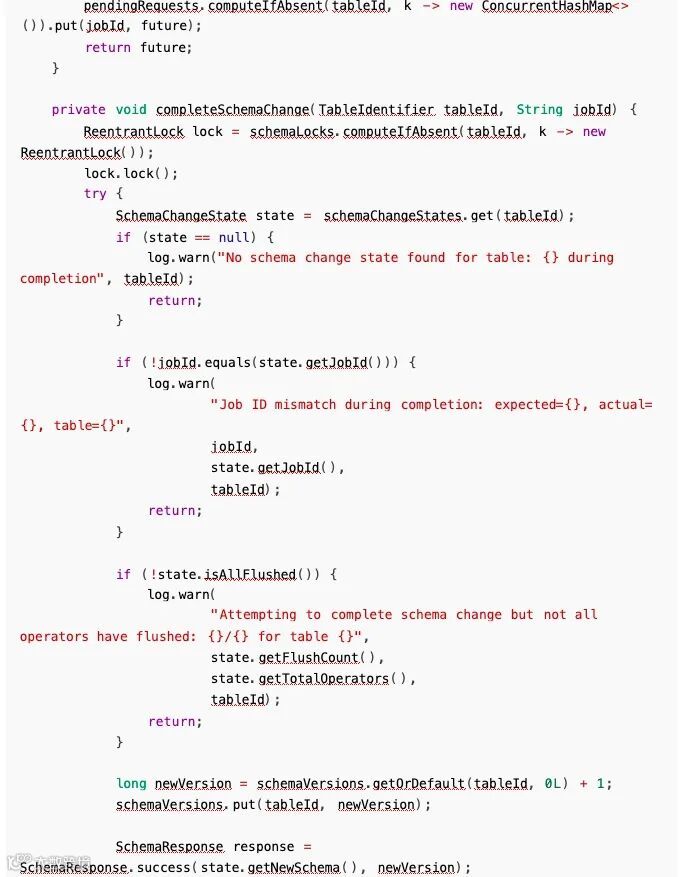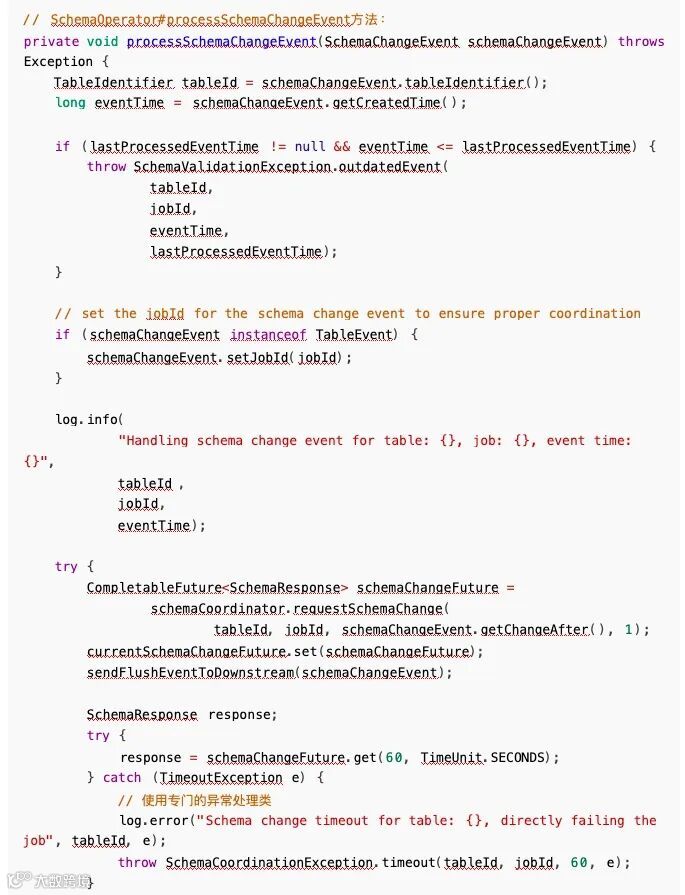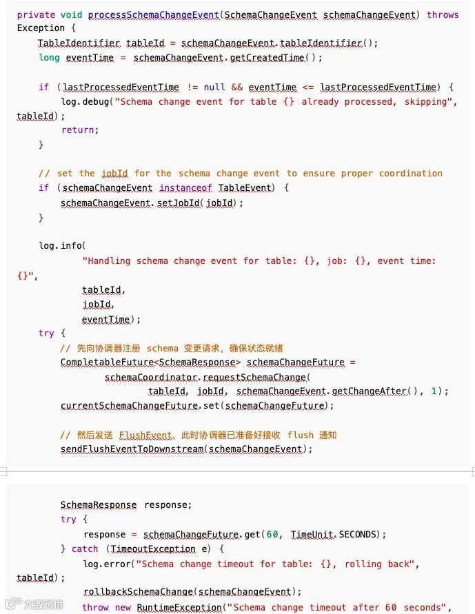 之前在 SchemaOperator 算子里面处理变更事件的时候,我先发送了刷写事件,之后才请求协调器 进行变更,这样会有一个问题,协调器内部的 SchemaChangeState 还没有进行初始化,所以之后协调 器迟迟获取不到 State,先一步到的 FluEvent 也没有被成功接收, 一直阻塞,之后任务超过了我设定的 超时时间,任务就失败了。