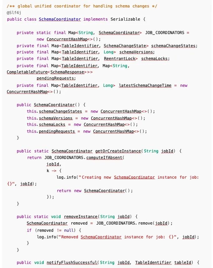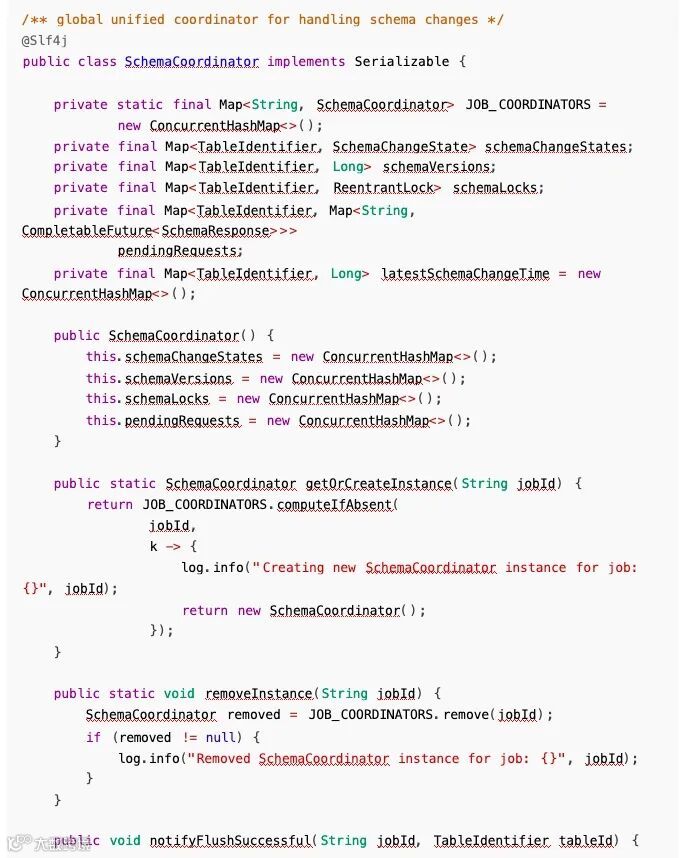 ✅实现 SchemaCoordiantor 协调器,接收 sink 端上报的刷写信息,同时接收 SchemaOperator 上 报的 Schema 变更请求。