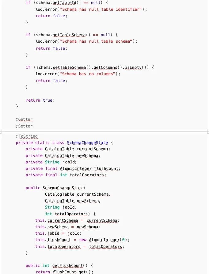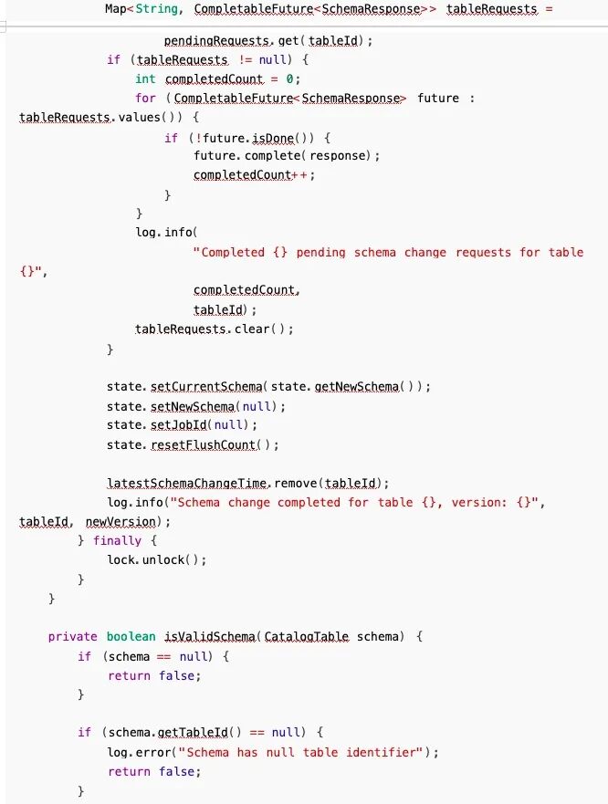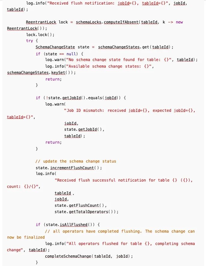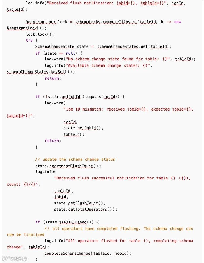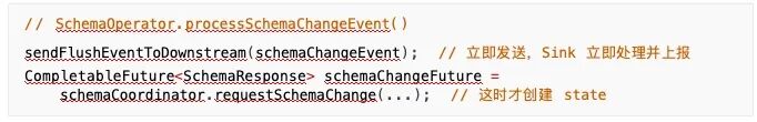 所以问题就比较明显, Sink 的 flush 通知比协调器的 requestSchemaChange 更早到达,导致通知 被丢弃,我们只需要修改执行顺序即可解决此问题:
