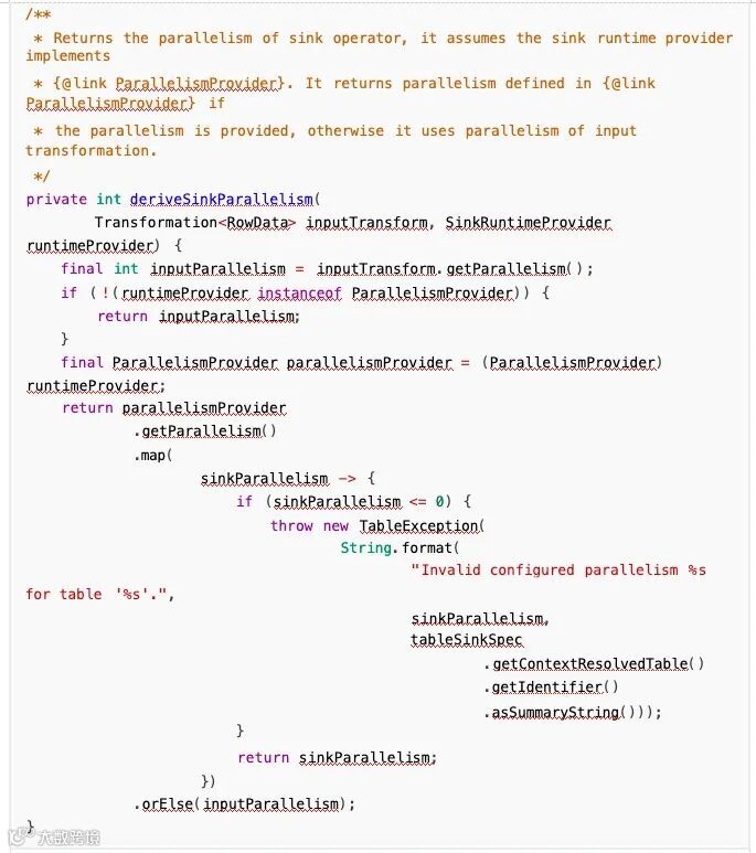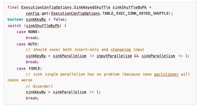 具体实现里面,会先检查 sink 端和 input 的并行度是否相同,如果不同,会采取 primary key shuffle 的手段: