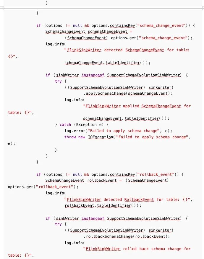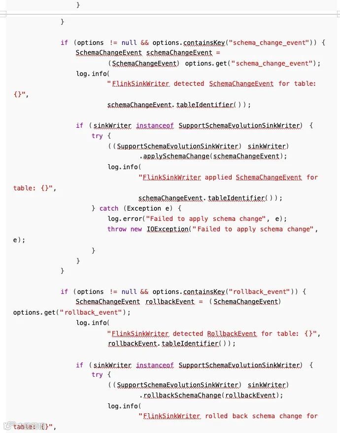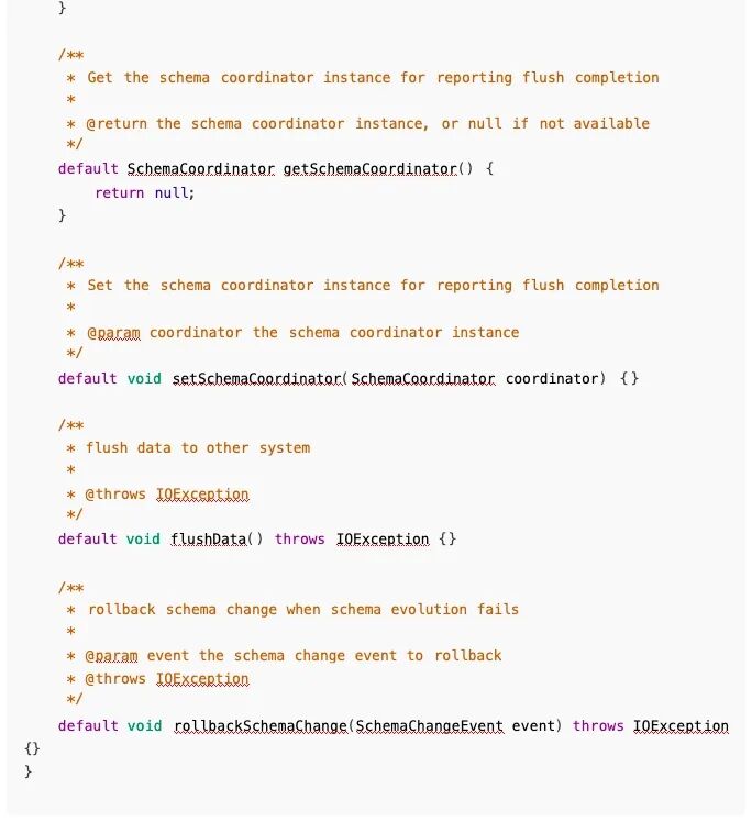 目前为了向前兼容,SupportSchemaEvolutionSinkWriter 中新增方法均被标记为 default,之后再 进行迭代。迭代完毕之后,即可取消 default 关键字: