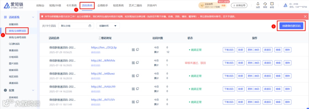 👉生成后的活码是永久有效的,但为其上传的每个微信群的二维码7天后仍然会失效,因此需要定期登录爱短链后台,更新活码中的群二维码,这样才能实现该活码的长期使用。
