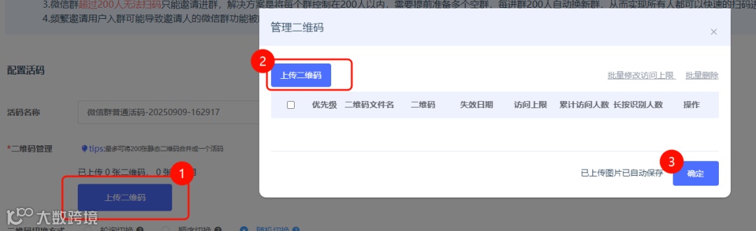 注意!!若预计推广超过200人,请务必上传多张群二维码,可将扫码的客户分批导流到多个群内。