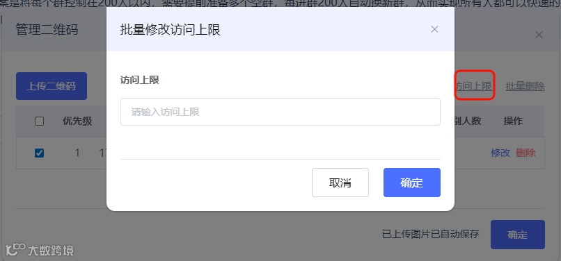支持【批量修改访问上限】,可以实现一次性修改多个群二维码的访问上限值,统一配置更高效。