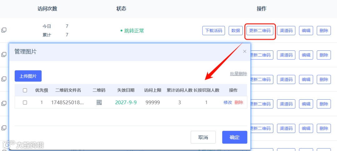 活码使用一段时间后,如果有粉丝群二维码已经过期,或者有群已经满员,需要新群进行推广,可以点击【更新二维码】,在弹出界面上更新已过期的群二维码或者上传新的群二维码。更新后入口活码不变,也无需重新发放活码。