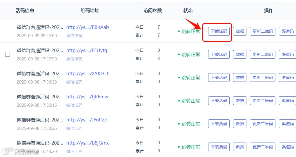 活码配置完成后点击确定,将在列表看到您创建成功的活码。点击【下载活码】即可获得一个长期有效、可自动切换的二维码。