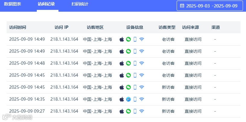 爱短链活码支持数据统计分析,在活码列表可见到基础的数据,在数据详情中可见访问数据图表、访问明细、单个群二维码扫码次数等数据。帮您实时掌握推广情况。