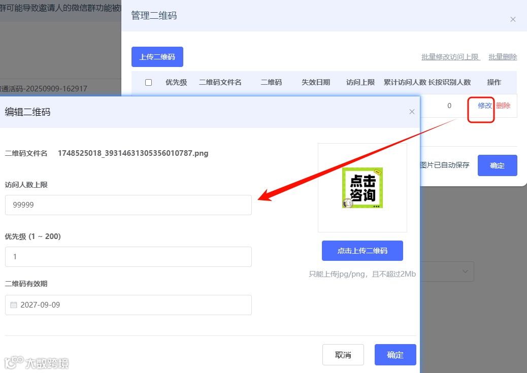 修改每张群二维码的访问上限: