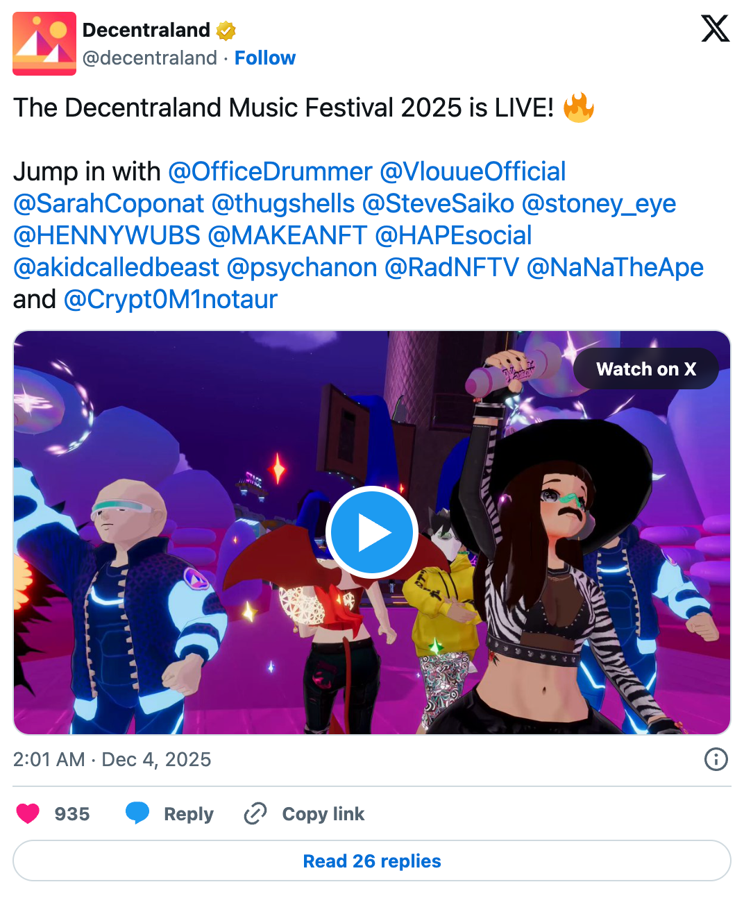 在 Decentraland 内部,虚拟的狂欢区再次形成,2025 年 Decentraland 音乐节正在进行中,为期四天的活动包括基于浏览器的音乐会、数字时尚发布和创作者搭建的舞台,活动时间为 12 月 3 日至 6 日。