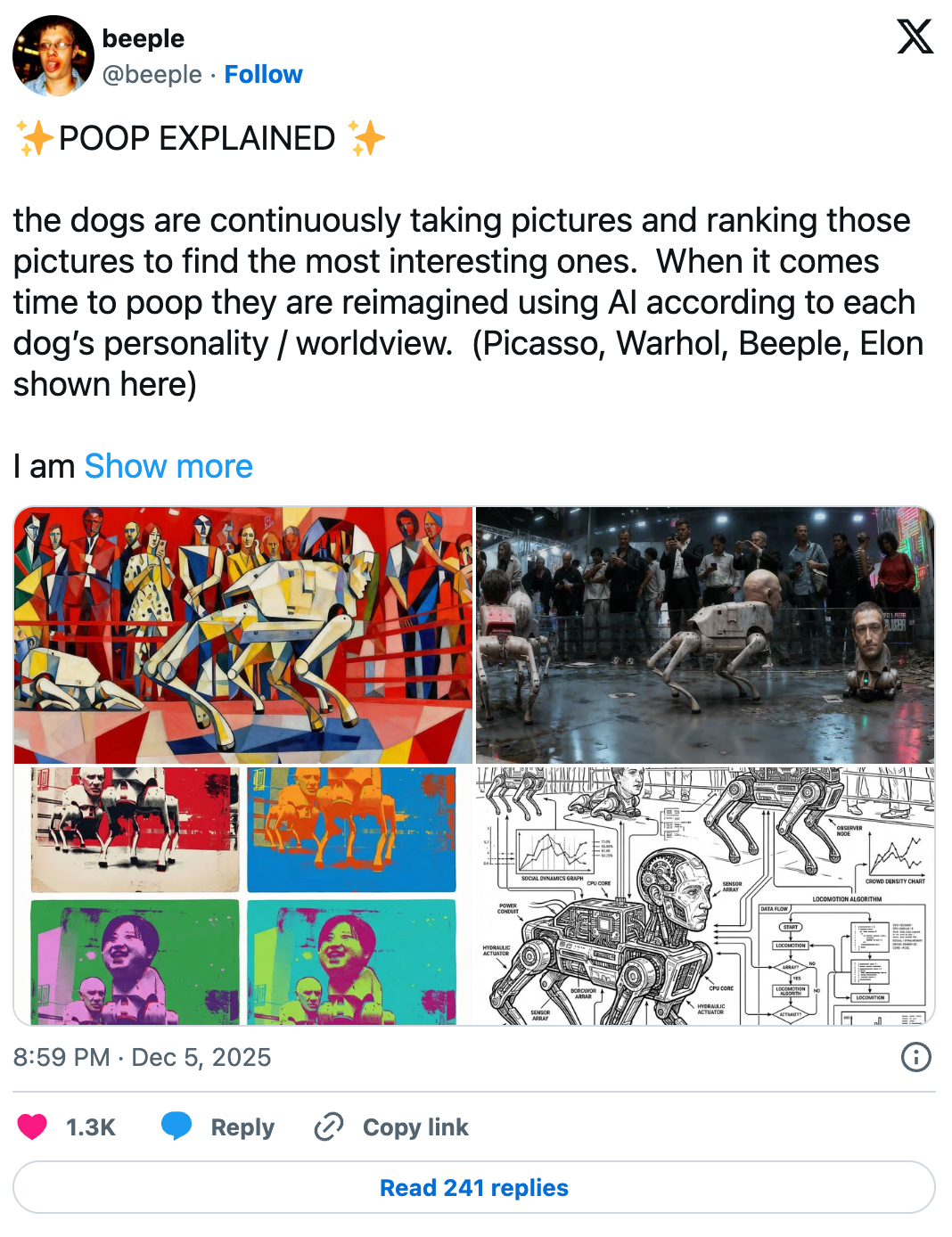 正如 Whitewall 所描述的那样,这件作品旨在引导参观者思考科技、身份和记忆之间的交织关系,通过赋予机器人“自主性”,Beeple 鼓励观众反思究竟是谁在塑造我们当下所见的一切。