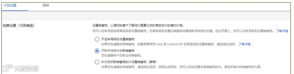 面向美国市场投放时,若提供免税服务,可在GMC中选择“不针对任何州收取销售税”。该设置需与实际经营策略一致。