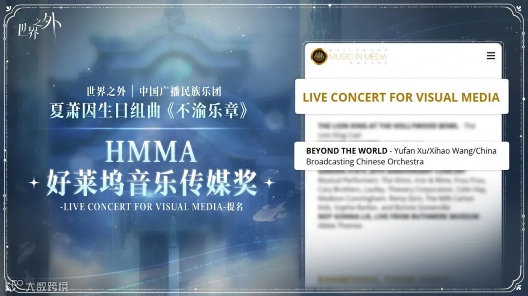 感谢玩家朋友们的支持和喜爱,由中国广播民族乐团奏响的《世界之外》夏萧因生日组曲《不渝乐章》,现已荣获好莱坞音乐传媒奖(HMMA)2025年「LIVE CONCERT FOR VISUAL MEDIA」提名。