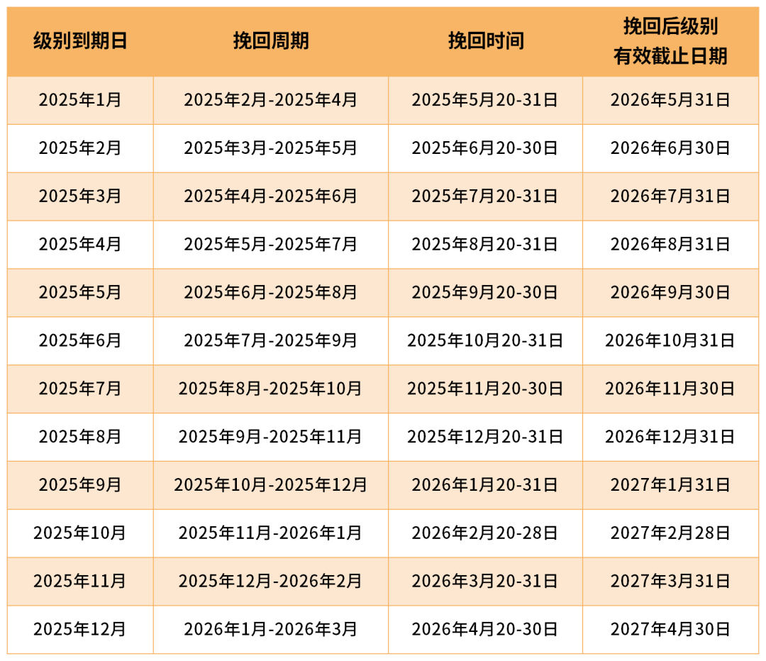 2025年1月至2025年12月各月到期后降级的现白金卡、金卡和银卡会员,挽回周期为降级后的3个月。挽回时间为挽回周期结束后次月20日至最后一天。