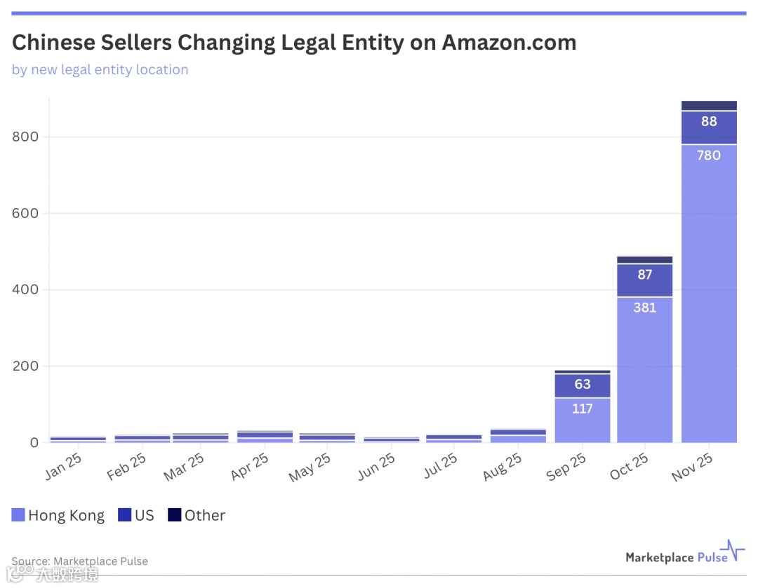 2025年11月,超780家中国卖家将其亚马逊店铺法人主体变更为中国香港,占当月全球894起法人实体变更的绝大部分。这一趋势显著提速:2024年全年每月变更量多为个位数;2025年9月升至117起,10月达381起,11月激增至780起[2]。
