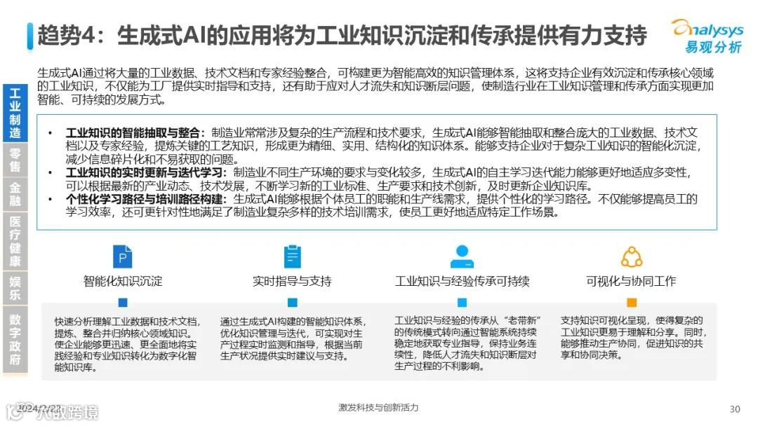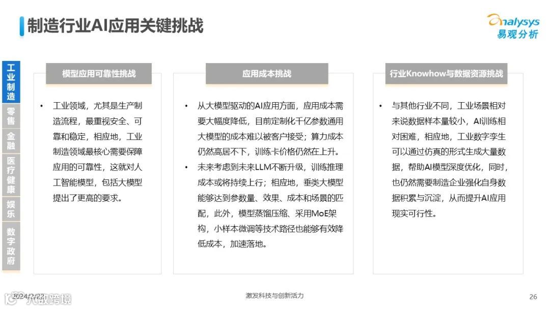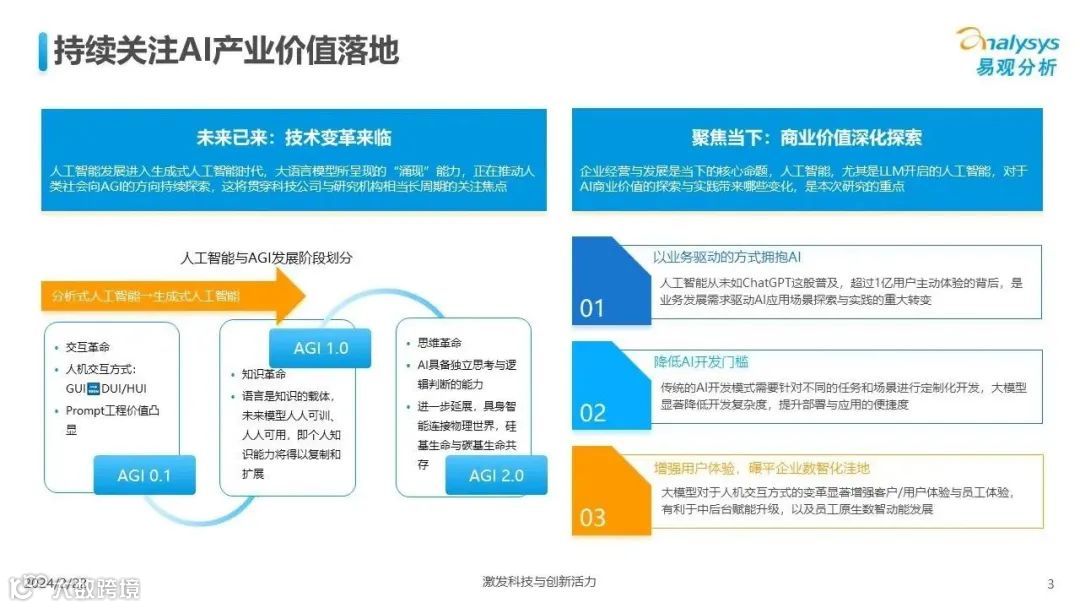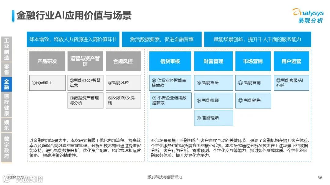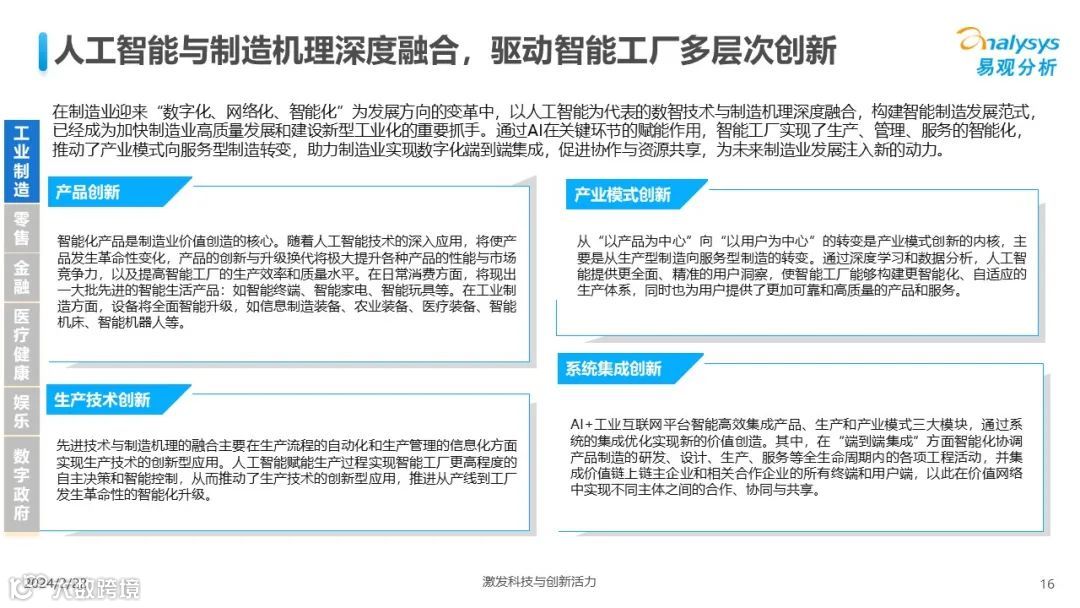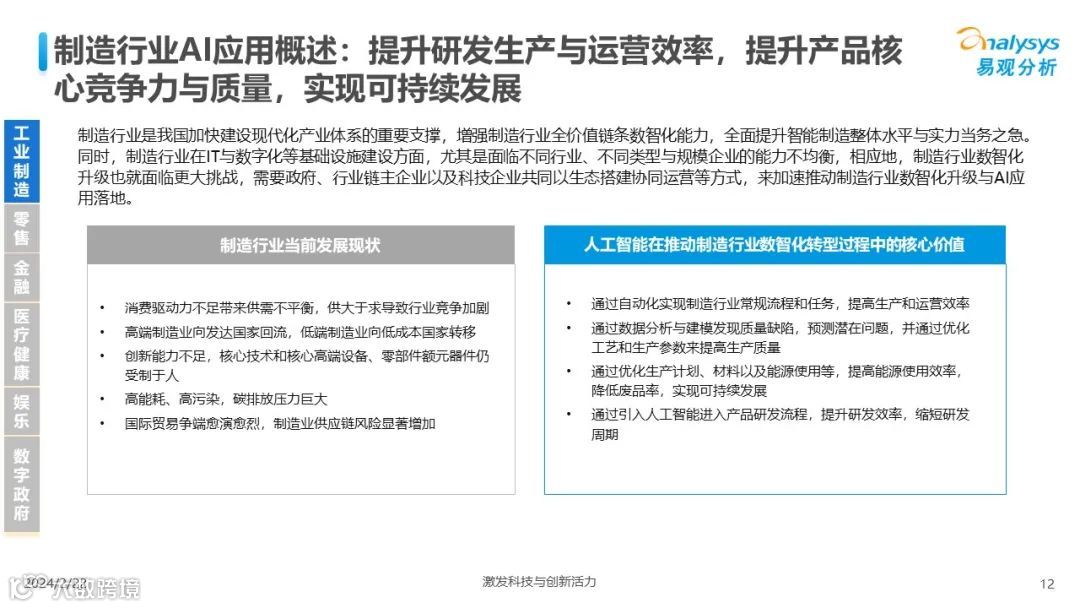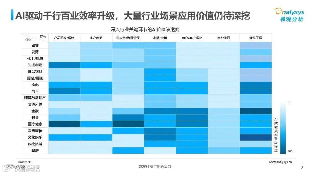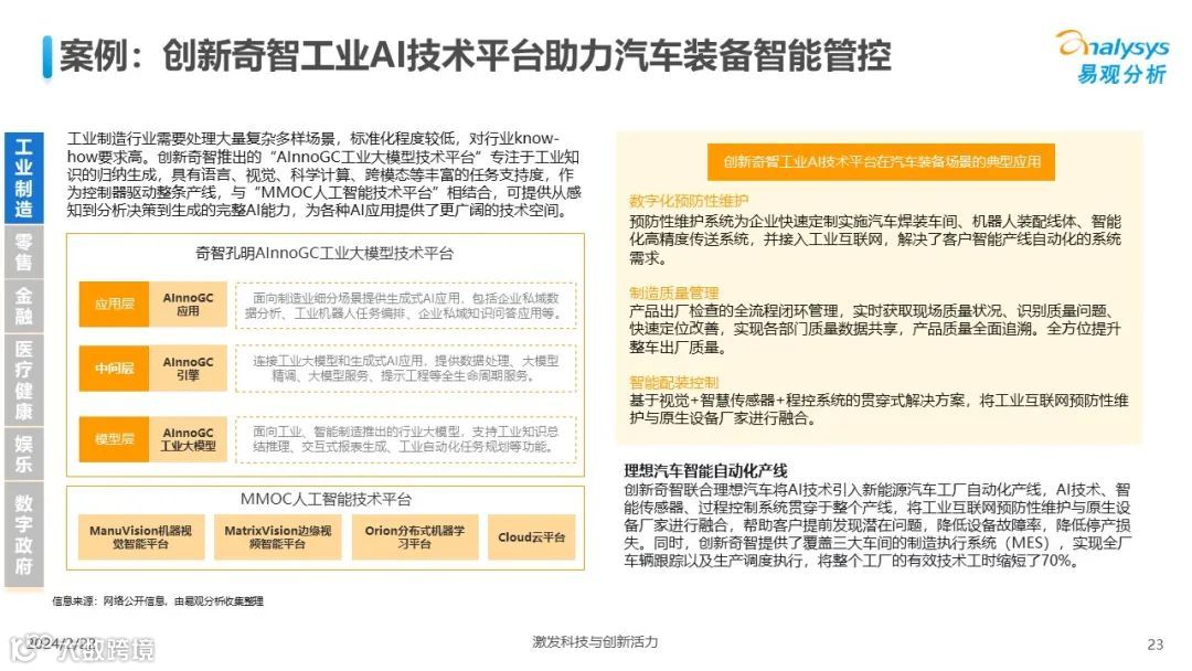 易观分析:人工智能发展进入生成式人工智能时代,大语言模型所呈现的“涌现”能力,正在推动人类社会向AGI的方向持续探索,这将贯穿科技公司与研究机构相当长周期的关注焦点。基于对人工智能技术发展与行业应用情况的长期跟踪与研究,《中国人工智能产业应用发展图谱2023》针对主要行业AI应用发展背景、关键价值、挑战和趋势,以及核心环节/场景的典型案例进行深入分析,全面展开产业AI智能化应用全景。