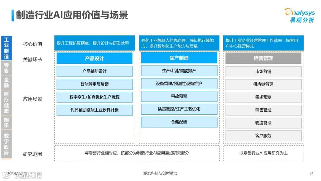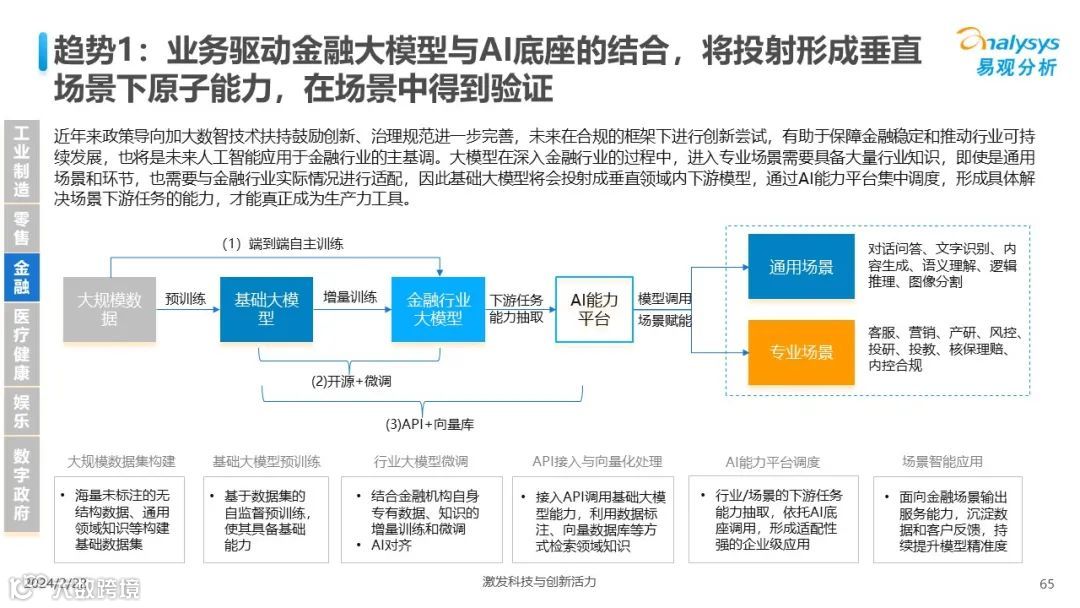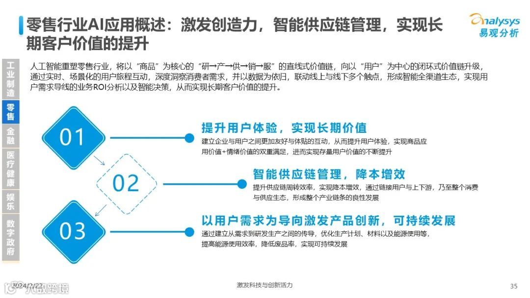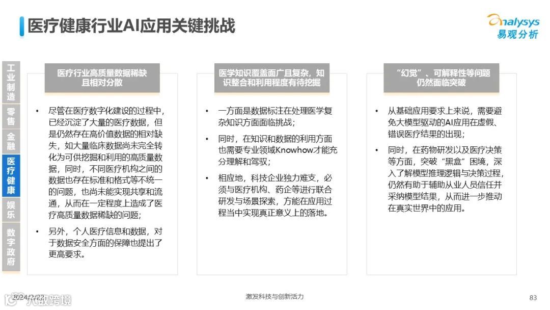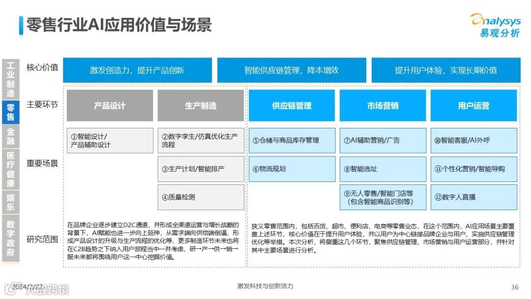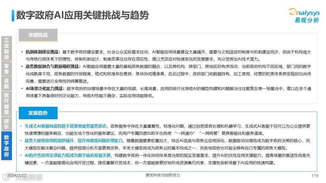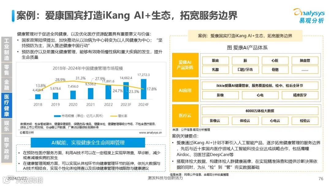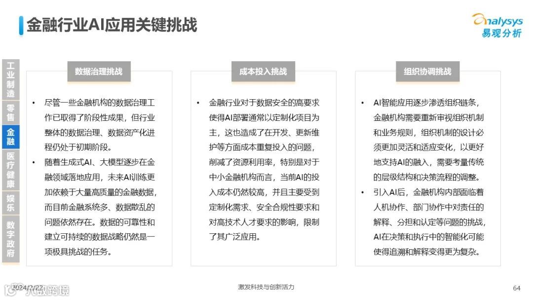 易观分析:人工智能发展进入生成式人工智能时代,大语言模型所呈现的“涌现”能力,正在推动人类社会向AGI的方向持续探索,这将贯穿科技公司与研究机构相当长周期的关注焦点。基于对人工智能技术发展与行业应用情况的长期跟踪与研究,《中国人工智能产业应用发展图谱2023》针对主要行业AI应用发展背景、关键价值、挑战和趋势,以及核心环节/场景的典型案例进行深入分析,全面展开产业AI智能化应用全景。