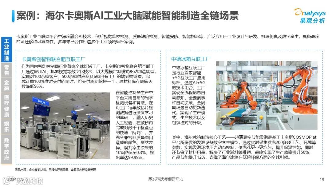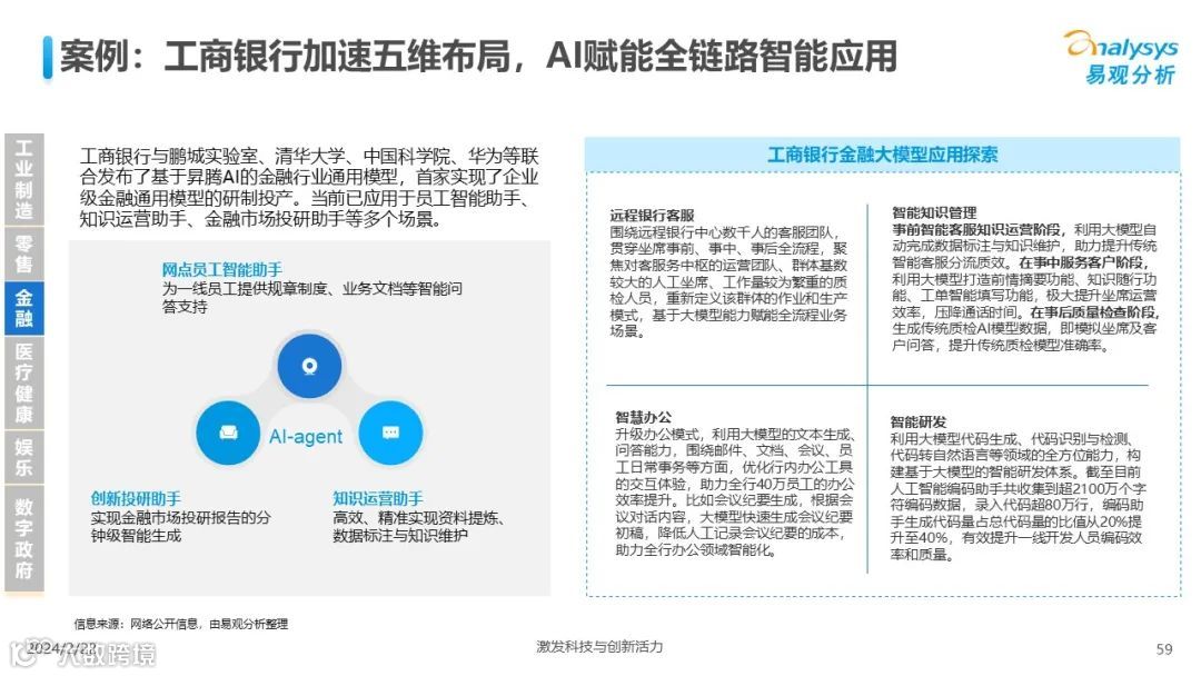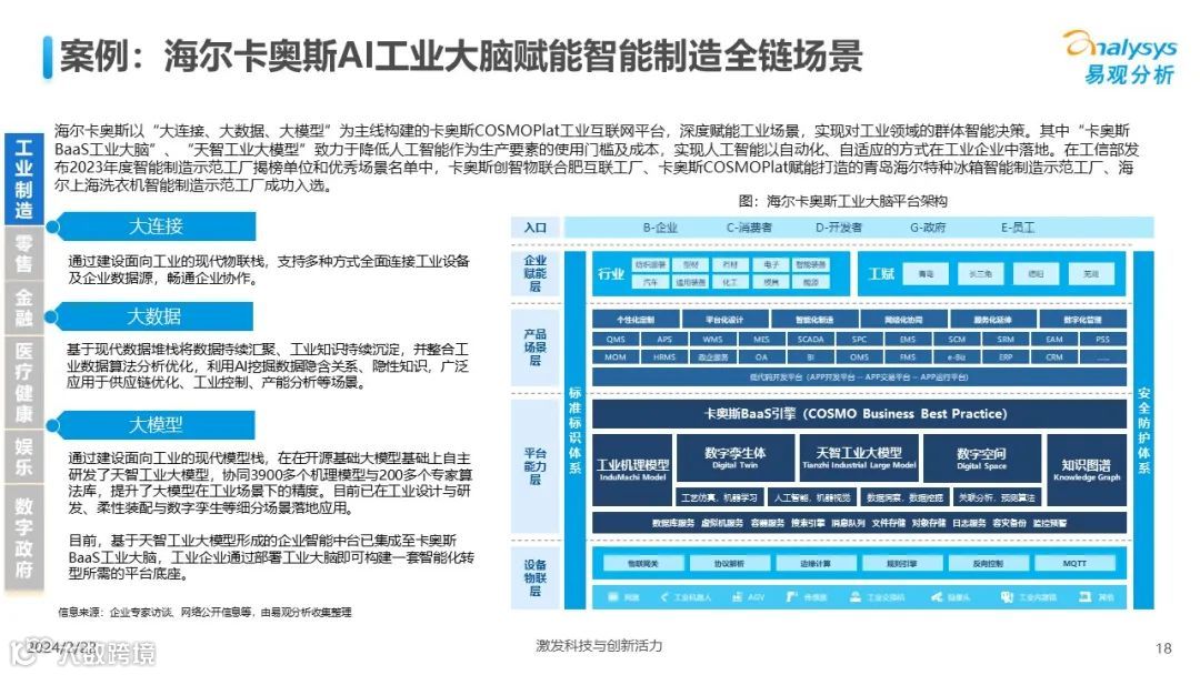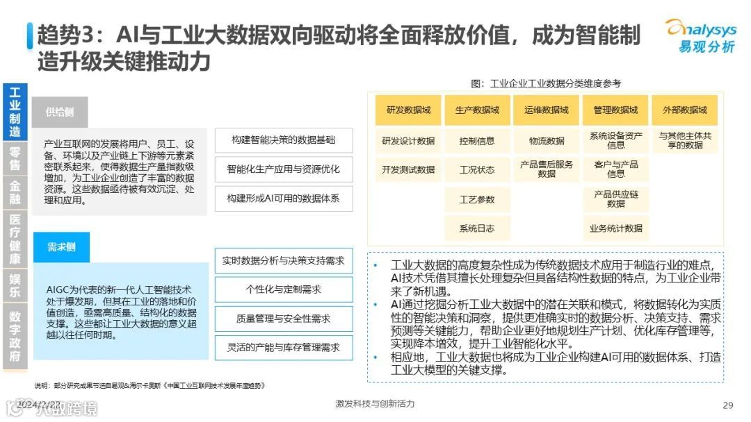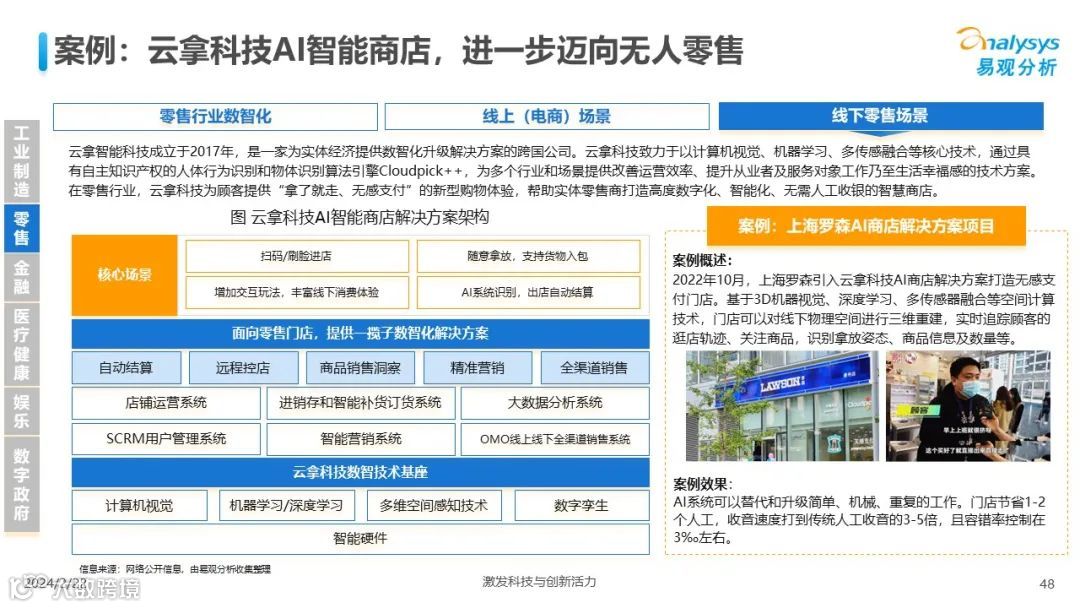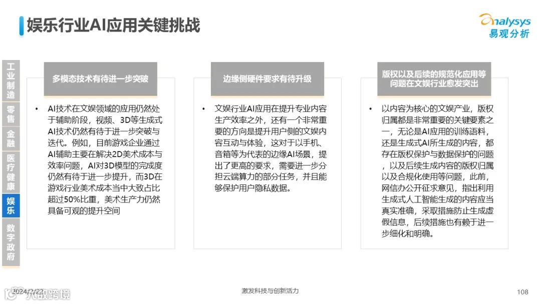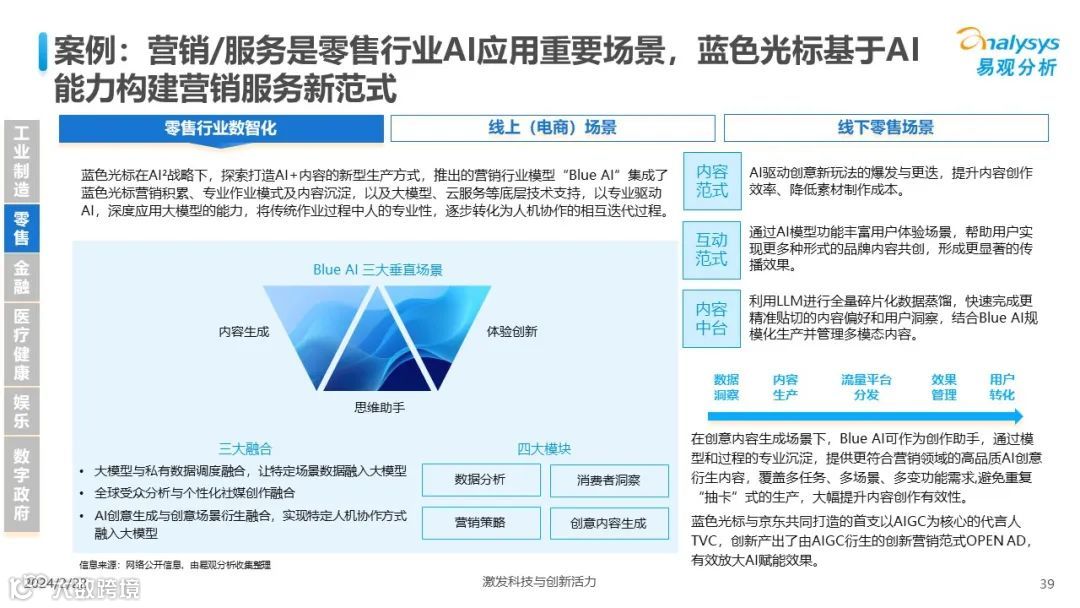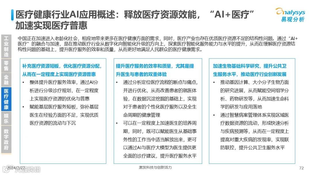 易观分析:人工智能发展进入生成式人工智能时代,大语言模型所呈现的“涌现”能力,正在推动人类社会向AGI的方向持续探索,这将贯穿科技公司与研究机构相当长周期的关注焦点。基于对人工智能技术发展与行业应用情况的长期跟踪与研究,《中国人工智能产业应用发展图谱2023》针对主要行业AI应用发展背景、关键价值、挑战和趋势,以及核心环节/场景的典型案例进行深入分析,全面展开产业AI智能化应用全景。