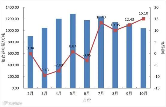 10月,主要沿海内河港口企业完成粮食吞吐量1480.69万吨,同比增长23.6%,其外国贸易吞吐量727.29万吨,同比增长28.1%。1—10月累计1.58亿吨,同比增长5.3%,其中国外贸易吞吐量7667.54万吨,同比下降8.7%。主要粮食接卸港(大连港集团、青岛港集团、广州港集团等)10月吞吐量1036.43万吨,同比增长15.10%;1—10月累计1.12亿吨,同比增长0.38%。